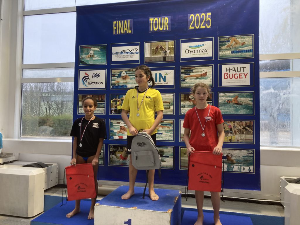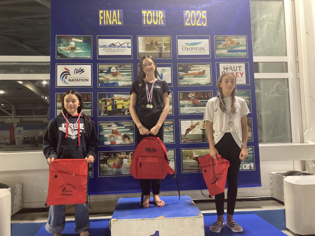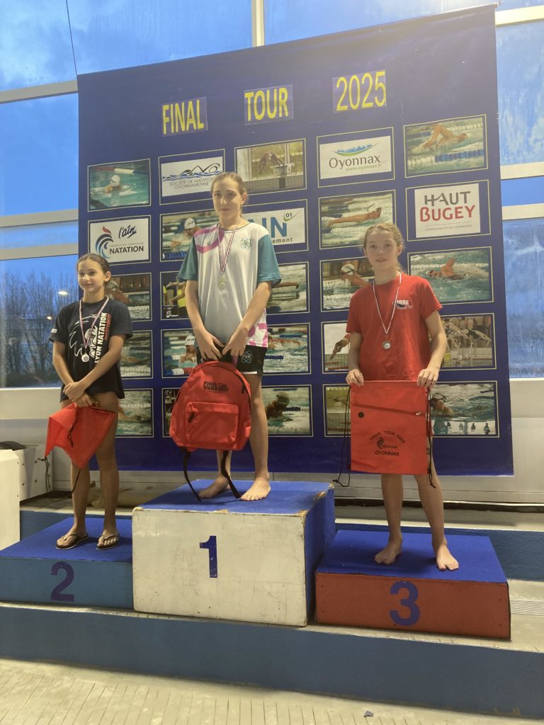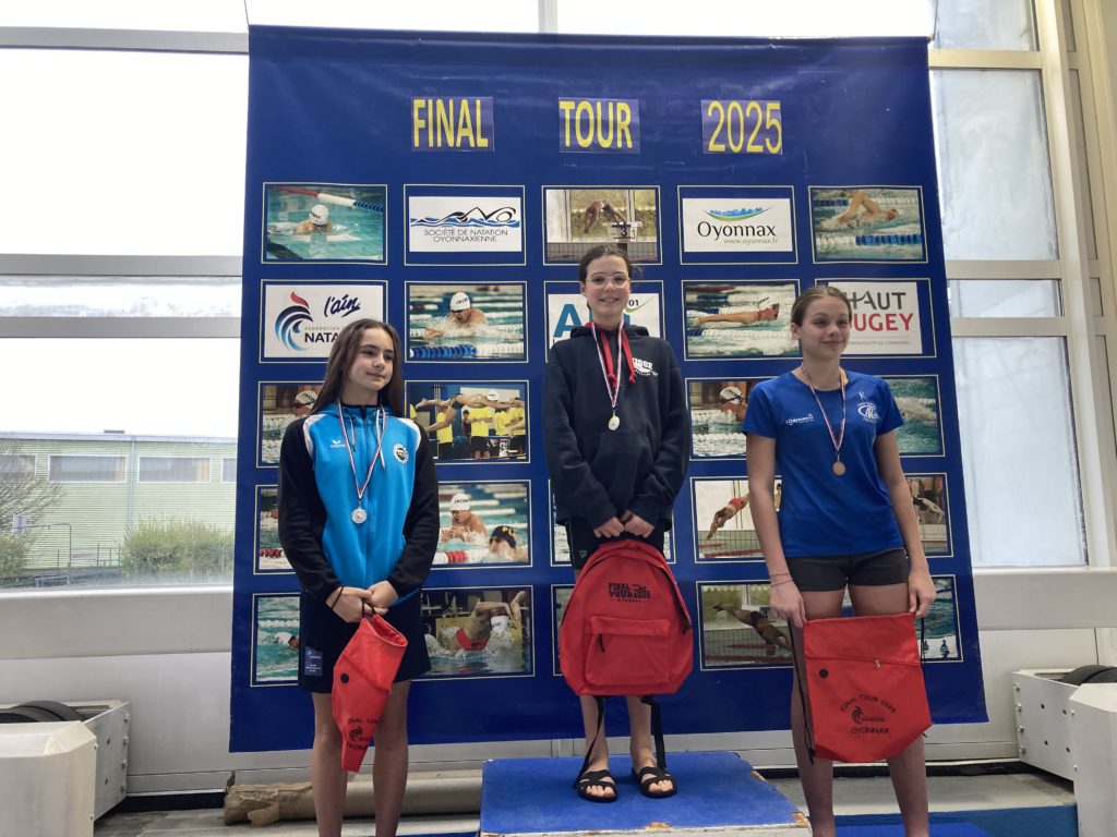 Julia s’empresse ensuite de nager le 200 4 nages en 3’05, comme à Bourgoin-Jallieu. Lucie et Anaïs entrent ensuite en lice pour le 100 papillon. Lucie bat son record en signant un nouveau record personnel en 1’28. Elle battra plus tard dans la journée le record au 50m dans cette même nage en 36’’5. Belle progression! Quant à Anaïs, elle part aussi vite qu’à Bourgoin Jallieu, mais cette fois-ci améliore considérablement son retour pour finir en 1’22. Nouveau record battu de 2 secondes et nouveau podium à une belle troisième place.